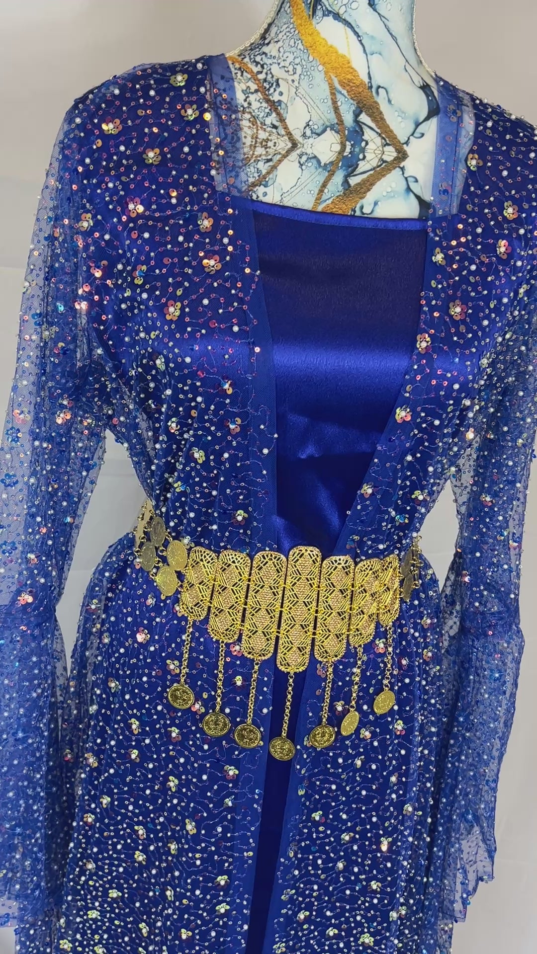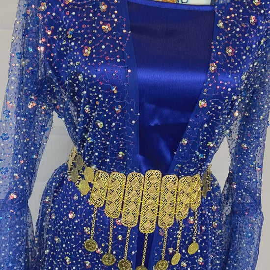 Kurdischer Luxus-Kaftan in Königsblau – Handverziert & mit goldenem Zinar-Gürtel