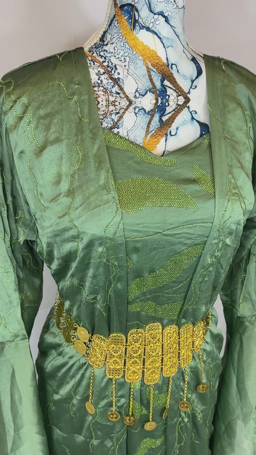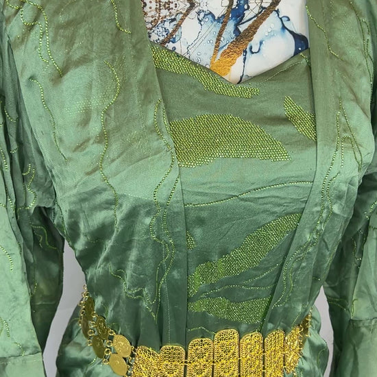Kurdischer Luxus-Kaftan in Olivgrün – Handverziert & mit goldenem Zinar-Gürtel