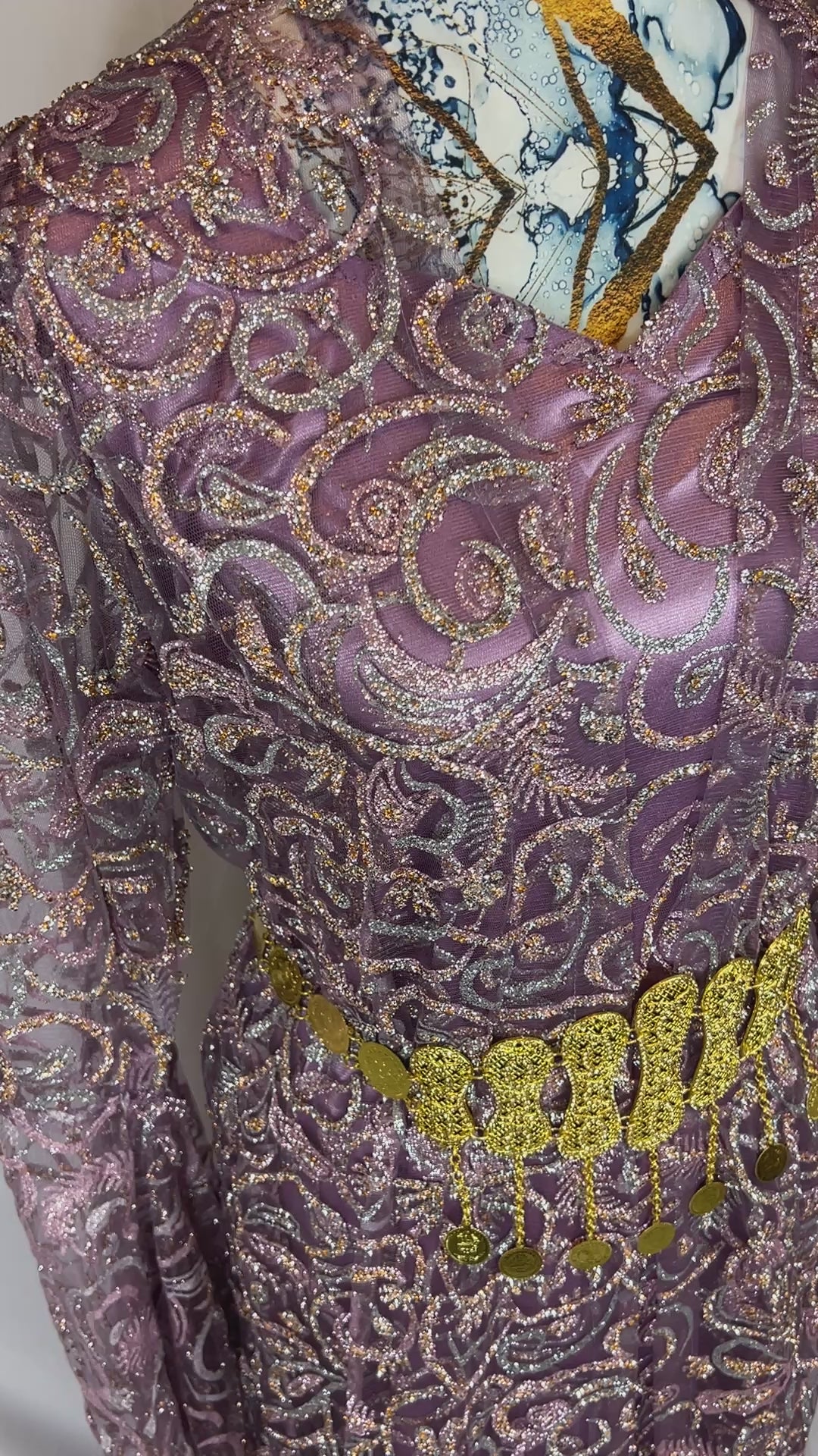 Gürtel: Goldfarbener Zinar-Gürtel mit traditionellen Ornamenten und Münzanhängern – ein Symbol für Reichtum und Anmut