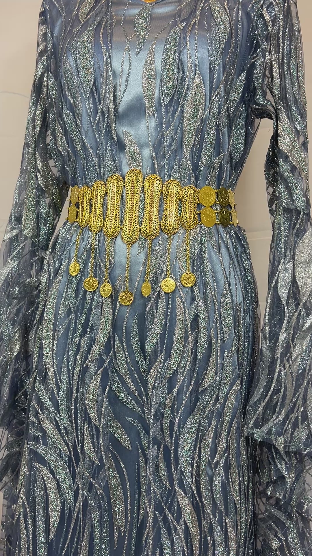 Gürtel: Aufwendig gearbeiteter goldener Gürtel (Zinar) mit traditionellen Ornamenten und hängenden Münzanhängern – Symbol für Reichtum und Stärke