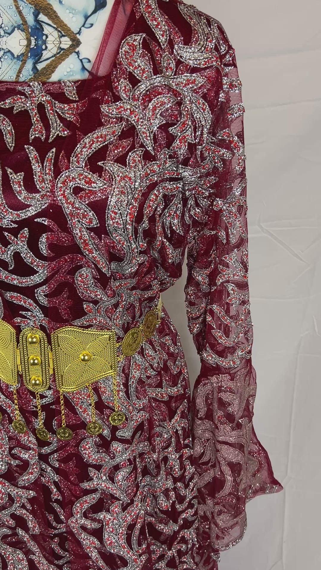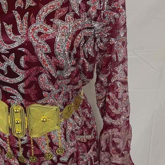 Kurdischer Luxus-Kaftan in Bordeaux-Rot – Handverziert mit Silberglitzer & Goldgürtel